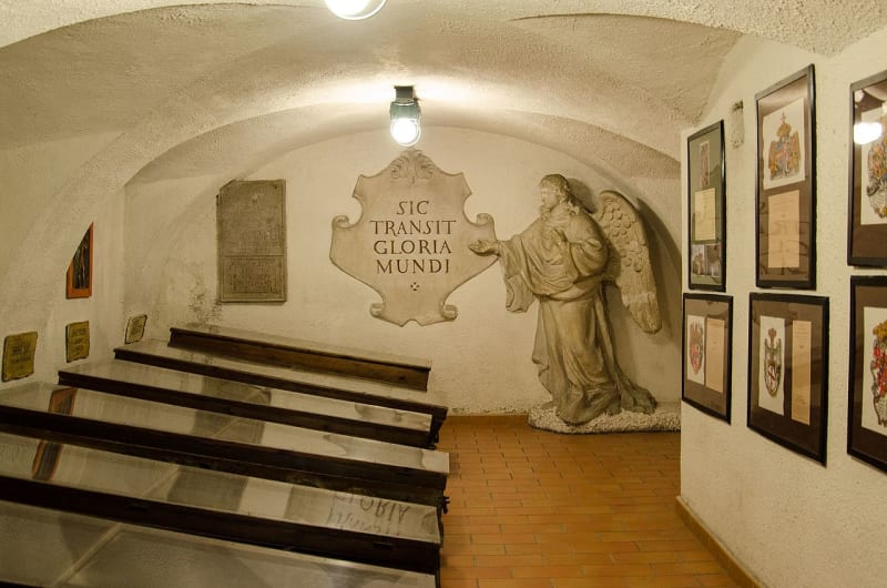 Zřejmě nejzajímavějším místem je krypta nacházející se pod kostelem, kde bylo možno již od postavení kostela a kláštera pohřbívat těla, která díky systému vzduchových průduchů přirozeně mumifikovala. Zachovaly se i některé barokní malované rakve, ve kterých jsou uloženy ostatky osob, kteří kapucínům pomáhali či se s nimi přátelili. Kapucíni byli pohřbíváni prostě – na zem pouze s kameny či cihlami pod hlavou. V kryptě odpočívají těla příslušníků řádu, ale také baron František Trenck či stavitelé O. a J. Křitel Ernovi.