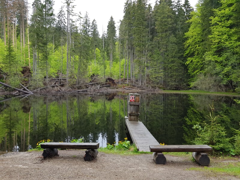 Po zdolání vrcholu budete sestupovat k Boubínskému jezírku, které je výchozím bodem naučné stezky a při průchodu naučnou stezkou na vás čeká 9 informačních tabulí, které Vás seznámí s historií Boubínského pralesa, jezírka a místní faunou či flórou.