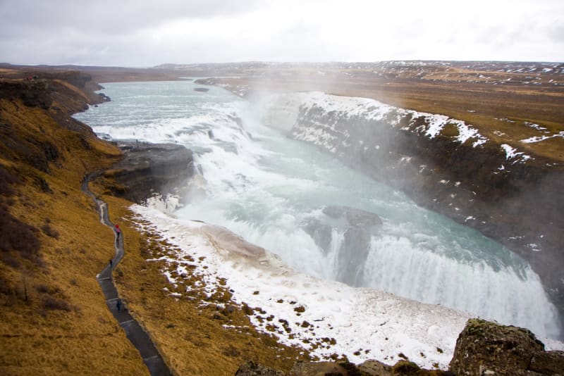 V překladu Zlatý vodopád leží na řece Hvíta jen 6 kilometrů dále po silnici od Geysiru. Tento majestátní a obrovský vodopád leží zaříznutý v dlouhém kaňonu a padá dokonce dvakrát za sebou. Po frekventované stezce se můžete dostat od parkoviště až přímo mezi ony dva vodopády. Jen si na sebe nezapomeňte vzít nepromokavou bundu, protože vodní tříšť vznikající především z toho druhého vodopádu by vás jinak dokázala promočit skrz na skrz.