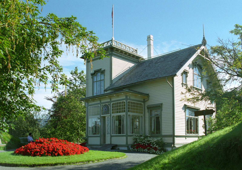 Dávno, dávno již tomu. Nočním vlakem do Bergenu (zaspala jsem příjezd, buzení průvodčím a tak rychlý výstup skoro s botami v zubech). Z místního autobusáku dál autobusem (tuším č.stání 21) do Troldhaugenu. Bohužel - další smůla - řidič asi nerozuměl mému tanečku, že mne má upozornit na výstup, přejela jsem na konečnou, ale nechal mne s ním se vrátit. Dál už idyla, krásná cesta podzimním lesoparkem, říjnové ráno, tudíž žádní turisté. Vnitřní prohlídku krásné vilky jsem z úsporných důvodů vynechala, špiclovala jsem ale sklem ve dveřích chatky skromné zařízení, kde Grieg skládal - pianino, gauč, u okna s výhledem na vodní plochu psací stůl s dřevěným křesílkem s područkami. Ve skále vytesaný koncertní sál otevřený skleněnou stěnou k chatce a vodě. První sluneční paprsky rozpouští mlhu a jinovatku a přichází těžká romantika tohoto krásného přírodního koutku, kde věřím, že se noty ke skládání daly přímo kolem sbírat. Doráží první návštěvníci, tak ještě zamířím ke skalnímu hrobu Edvarda a jeho ženy Niny. Díky, Pane skladateli, že jsem tu "live" mohla prožít to krásné Ráno na Troldhaugenu z Vašeho Peer Gynta.