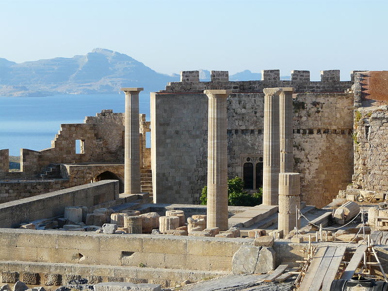 Městečku Lindos na ostrově Rhodos vévodí akropole, stojící a shlížející na město z vysokého útesu, odkud se člověku naskytne fascinující rozhled do okolí. Nejvýznamnější památkou akropole jsou zbytky dórského chrámu bohyně Athény, pocházející z dávného 4. století před naším letopočtem. Bohyně Athéna byla uctívána ještě dříve, než jí byl postaven zdejší chrám. Další památkou je helénská stoa, kolem které byla postavena johanity pevnost. Povedlo se jim tehdy spojit starověkou a středověkou architekturu. Poslední stavbu, kterou zde naleznete, je kostel sv. Jana.