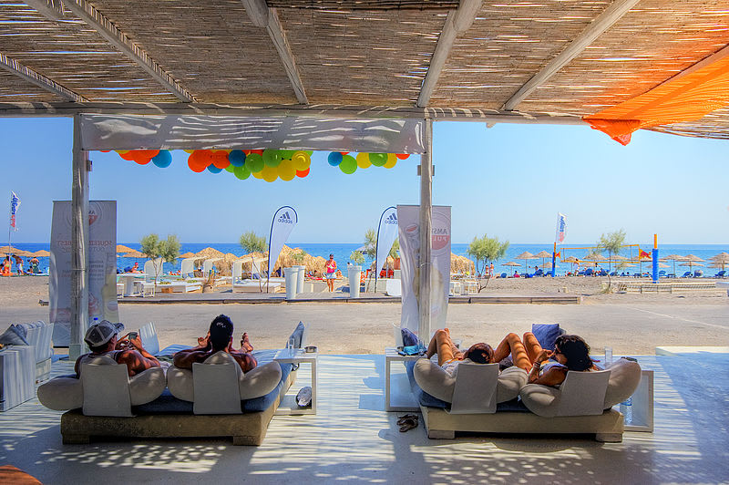 Perrisa, pláž, která je považována za nejhezčí na celém ostrově. Charakteristický černý písek, křišťálově čistá voda a spousta plážových zařízení. Obří skála Mesa Vouno vystupuje z moře a to je jedno z největších lákadel této pláže.