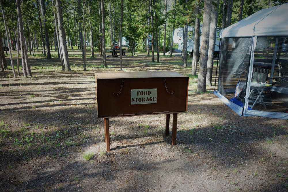 - Vždy používejte „storage boxy“ na veškeré jídlo, pití, kosmetiku,…vše s nějakým zápachem. Nenechávejte jídlo ani odpadky nikde ležet, odpadky vyhazujte do speciálních bytelných odpadkových kontejnerů a košů. Medvědi mají mlsné jazýčky a cítí na míle daleko. Budete-li tato pravidla striktně dodržovat, neměli byste se nezvaných nočních návštěvníků bát. Toto pravidlo je však důležité i kvůli medvědům samotným. Lidské jídlo není pro ně zdravé, učí se špatným nepřirozeným návykům v hledání potravy, a co je nejhorší, mohou se vracet pro jídlo pravidelně a stát se tak lidem nebezpečnými a být usmrceni. Myslete na to, co můžete medvědům způsobit!