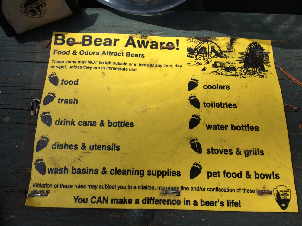 Vždy dodržujte pokyny rangerů, především ohledně úschovy vašich potravin a dalších vyjmenovaných věcí ve speciálních protimedvědích boxech (storage boxes), kterých jsou kempy plné.