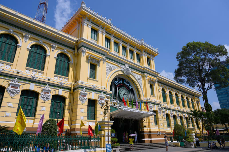 Při vstupu na poštu vás ohromí klenutá okna, mramorově dlážděná podlaha a telefonní budky, které připomínají důležitost pošty v dřívějších dobách. Velká mozaika vůdce Ho Či Minh na konci klenuté haly vás ujistí, že jste stále ve Vietnamu. Nad hlavou se nachází dvě vymalované mapy regionu; jedna z nich prezentuje telegrafní linky, které křižují Vietnam a Kambodžu a druhá zobrazuje mapu oblasti Saigonu v roce 1892.